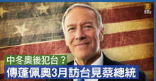 2022-01-25 20:30:49烏克蘭情勢緊張,前白宮國安顧問近期警告,中共可能正考慮是否在冬季奧運後進犯台灣。媒體(25日)報導,傳出前國務卿蓬佩奧將於3月訪問台灣發表演說,會見總統蔡英文及國安外交高層。不過,外交部回應,目前尚無具體的訪台細節。