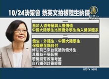 2016-10-24 20:29:02插播一則最新消息,總統蔡英文傍晚召開執政決策協調會議,會中拍板,來台就讀的中國大陸學生,可以比照僑、外生納入健保。但考量政府資源有限,未來陸生與僑、外生,必須全額自付保費,政府不再補助。總統府認為,來台就讀的學生都能夠公平納入健保,下一階段將修健保法,至於何時修法完畢?還需由立法院黨團規劃。
