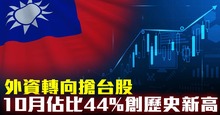 2020-10-22 20:29:31台灣從國際疫情爆發以來,穩定的經濟表現,成為外資停泊資金首選,根據金管會數據,10月21日,外資佔比達到44%,創下歷史新高,10月就明顯大量買超台股,顯示不論外資、國人民眾,對資本市場都相當有信心。