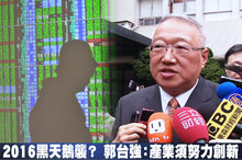 2015-12-31 20:14:16國際貨幣基金組織預估,明年2016經濟成長令人失望,專家警告至少將有三大黑天鵝影響經濟表現,對此,電電公會理事長郭台強今天表示,台灣明年選後的政策變化,是一大問題,認為台灣產業勢必要思考如何創新。