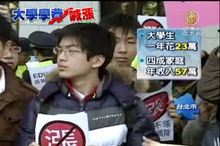 2012-03-26 21:14:24新聞焦點轉回台灣。日前傳出教育部,準備調漲大學學費,雖然還沒有做出決議,但是上午就有一群大學生和勞工團體代表,集結在教育部門口,發出怒吼,他們說大學生畢業後,找不到工作,學費應該調降,不該調漲。