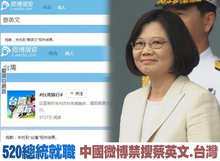 2016-05-20 12:46:12台灣首位女總統蔡英文今天就職,但是中國網路平台「微博」,卻傳出封鎖搜尋「蔡英文」與「台灣」等關鍵字,如果鍵入「蔡英文」,就會出現「抱歉,未出現『蔡英文』相關結果」。搜尋「台灣」,只會出現一個「台灣旅行」的連結,再來也是一樣顯示「未出現相關結果」。不過,如果用中國鄉民對蔡英文另類叫法「蔡大媽」,就可以找到總統就職的相關貼文。