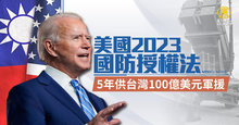 2022-12-24 20:11:4323號,美國總統拜登簽署了《2023年度國防授權法案》,其中納入了部分《台灣政策法案》,授權未來5年,提供台灣100億美元軍援,並且要求加速處理台灣軍購,為台灣送來了聖誕大禮。