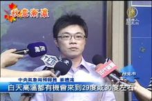 2017-09-28 20:03:22新聞首先來關心天氣,今天白天天氣還是好熱,中午台北最高溫來到了35.6度,不過氣象局指出,入秋以來「首波鋒面」今晚報到,隨後東北風增強,北部及東半部地區會稍稍降溫,明、後天北台灣高溫約30到33度,夜間清晨低溫約25、26度,感受上會較為舒適,並由北而南逐漸轉為有局部短暫陣雨的天氣。