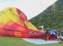 2013-07-06 21:47:55熱氣球旋風從花東吹到高雄,6日上午三顆繽紛亮麗的熱氣球,飄揚在澄清湖上空,可惜風勢太大,原定邀請6對新人體驗搭乘熱氣球, 結果臨時喊停,還好主辦單位的拋繡球送總統套房遊戲,讓獲獎的新人們笑開懷。