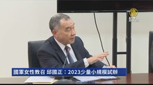 2022-12-28 20:08:35總統蔡英文昨天記者會,宣布國軍義務役役期恢復為一年,從2024年元旦實施。國防部長邱國正今天(28日)拜會立法院在野黨團,親自說明。時代力量立委王婉諭希望未來可以將女性官兵納入教召對象,邱國正證實,明年教召將試辦女性教召,只是受限於各項設備、各方面還不成熟,先招募十幾人,若成效好第二季編成為一個連,未來再視情況擴大辦理。