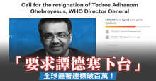 2020-04-24 20:24:41中共肺炎蔓延全球,各國紛紛指責中共隱瞞疫情、世衛組織(WHO)為中共護航,耽誤黃金防疫時機,尤其WHO秘書長譚德塞的親中共言行,更引發各國不滿。國外網友1月31日發起「要求譚德塞請辭」連署活動,今(24日)天下午5時46分,突破100萬人連署門檻。這份連署書推出3個月以來,持續受到全球追蹤矚目,連署書寫到「譚德塞不適任,呼籲譚德塞立即辭職」,「台灣的醫療技術比WHO中的部分國家更進步,WHO不應出於任何政治因素,將台灣排除在外。」