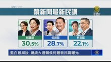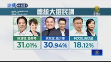 2023-11-27 12:37:10台灣總統大選今天有兩份最新民調發布,其中,鏡新聞,民調是在三黨候選人登記確定後進行的,結果顯示,民進黨賴蕭配獲得30.5%支持度、國民黨侯趙配28.7%居次、民眾黨柯吳配支持度為22.1%淪為第三。不過,另一份民調,台灣民意基金會在藍白破局前的11月19到22日做調查,基金會稱柯文哲以31.9%領先,賴清德則是29.2%第二名,侯友宜則是23.6%,兩份民調結果差異大。