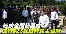 2019-08-23 20:09:09823砲戰61週年,總統蔡英文前往金門參加823中樞紀念儀式,在太武山悼念陣亡官兵,這也是蔡英文上任後,首次參加823紀念活動。蔡英文表示,沒有當年軍民浴血奮戰,就不會有今天的中華民國台灣。而巧的是,蔡英文隨後在海印寺參拜,碰上前總統馬英九,兩人也握手寒暄。