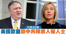 2019-06-05 20:57:45六四30週年,美國國務卿蓬佩奧特別發表聲明,呼籲中共釋放因爭取權利和自由而遭到拘留的人。歐盟也發表聲明,要求中共當局應釋放支持民主的活動人士。歐盟還強調,與中國的關係中,人權一直是重要基礎,「未來也是如此」。