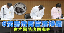 上周六,台大醫院爆出誤接洗腎管路事件,今天,院方首度召開記者會並公開道歉。台大醫院承認,的確有誤接管線事實,並且波及六位病患,但追蹤病患血液培養後並無異常,判斷其中兩位病人去世,與接錯洗腎管線無關。此事爆出後,衛福部要求台大三天內提出報告。