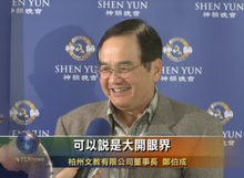 2013-03-09 21:27:10在中部地區經營文教事業的鄭董事長夫婦,幾年前與神韻晚會擦身而過,7日晚間,他們觀賞了美國神韻巡迴藝術團在台中中山堂的首場演出,鄭董事長說,神韻讓他感受到中國五千年文化和藝術的博大精深,真是大開眼界。