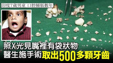 2019-08-23 19:50:31印度有一位男童罹患一種罕見的腫瘤疾病,整個腫瘤內竟然密密麻麻的長滿500多顆牙齒,歷經五小時的摘除手術後,最終從腫瘤中取出526顆牙齒,令人嘆為觀止。