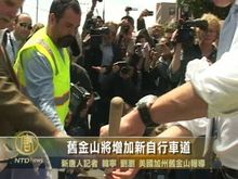 2010-08-10 13:56:38八月九日市府官員在舊金山火車站前舉行新聞發佈會,表示將在市內增加新的自行車線路。