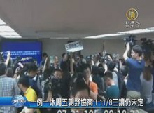 2016-10-07 20:14:36立法院周三火速通過「一例一休」勞基法草案初審,引爆朝野爭議。上午立法院長蘇嘉全再度召集四黨進行協商,但朝野討論近2個小時,還沒有達成共識,帶您來看,上午朝野協商過程的交鋒畫面。