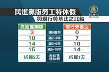 2016-12-02 20:08:38好,總統蔡英文日前拍板,要在年底前通過《勞基法》修法,民進黨團的勞工特休假版本昨天也出爐,條文規定,年資滿6個月可獲3天特休假,前5年的特休假規定 都優於公務員。按照現行勞基法規定,勞工工作滿半年 未滿一年,是沒有特休假的,公教人員也沒有;滿兩年未滿三年,有七天特休,滿三年未滿五年有十天,滿五年有十四天。民進黨團版本,比現行規定的,分別增加了三天、三天、四天及一天。不過勞團認為,民進黨要砍勞工7天國定假,說會增加特休假來補償,結果特休假仍低於公務員,何況勞工特休假不是想休就休,得要雇主同意,因此,對於這個