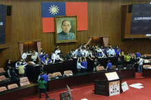 2016-10-27 12:41:05鏡頭轉回台灣。立法院衛環委員會今天(27)繼續處理前一次會議議事錄,也就是一例一休法案。朝野立委紛紛動員佔據主席台,在混亂中民進黨籍召委吳玉琴宣布議事錄有效,藍綠立委因此爆發衝突。