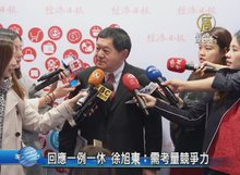 2016-12-07 12:45:09立法院昨三讀通過《勞基法》修正案,一例一休闖關成功,遠東董事長徐旭東表示,有些事情台灣有太多對沖的力量,衡量休假問題,要思考會不會影響台灣競爭力。