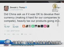2016-12-05 12:37:53再來看到,美國總統川普打破外交慣例,接聽台灣總統蔡英文電話,引起國際熱議,其中不乏許多擔心惹怒中共的聲音。對此,川普今天連發兩則推特,再度向中共喊話, 川普提到,「中共貶值人民幣,讓美國企業難競爭;對美國進口的貨物課重稅,美國沒有對他們徵稅;而且在南海蓋一堆軍事設施的時候有問過美國嗎?沒有吧!」
