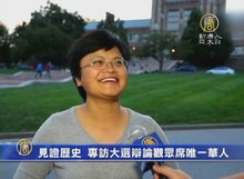 2016-10-12 20:37:39美國電視辯論已經有50多年的歷史。在星期天第二場美國總統大選電視辯論中,有一位華裔觀眾,坐在現場的第一排。本台採訪到這位密蘇里州的華人移民袁金雲,一起來聽一聽她在辯論現場的感受。