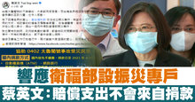 響應衛福部設振災專戶 蔡英文:賠償支出不會來自捐款