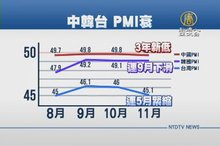 2015-12-01 20:33:05今天,中國大陸、台灣、韓國都公布,11月製造業採購經理人指數,表現都不樂觀,我們來看到圖表,中國數據來到三年新低,連4個月都呈現緊縮,處在景氣榮枯線下方。雖然中國央行,1年內6度降息,希望刺激製造業復甦,但效果仍然不大。而韓國已經是連9個月緊縮,出口訂單的跌勢加速。台灣則是連5個月緊縮,經濟表現持續疲弱。