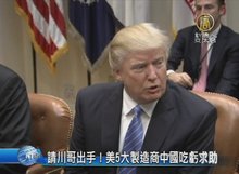 2017-01-25 20:16:02美國總統川普上任以來動作頻頻。周二在他的橢圓形辦公室,會見美國12大製造業執行長。其中有五家公司在中國經營遭遇阻力,他們也當面向川普求助,希望新政府能幫助他們,反擊中共的不公平競爭。