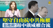 2022-09-16 12:33:37新聞開始先來關心,國際高度關注烏克蘭收復失土,與中共台海挑釁之際,中俄領導人召開普習會,俄羅斯總統普丁喊出支持「一個中國」原則,還稱美國在台海挑釁,對此,中華民國外交部今天表達嚴正抗議,強調這是顛倒是非、曲意奉承中國共產黨威權擴張主義的荒謬言論。