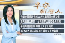 2018-02-01 07:04:27歡迎您收看2月1日的早安新唐人,我是鐘鈺麒。先來帶您關心今天的天氣情況。進入二月份,氣象局昨天對全台15縣市發布低溫特報,今天清晨玉山再降雪,今、明兩天嘉義以北沿海、空曠地區及金門、馬祖將出現10度左右低溫;到了週六,今年入冬最強寒流接力來襲,下週二前,台北市低溫將下探8度,沿海空曠地區低溫下探6度。提醒觀眾朋友做好保暖。帶您一起來看到國際媒體重要訊息。