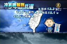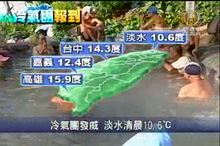 2011-12-02 21:06:44相信觀眾朋友今天早上出門的時候 ,一定覺得 好冷 。 今年冬天第一波冷氣團報到,清晨,淡水出現了入冬以來的最低溫13.3度,新竹也下探14.1度,而且氣象局還預測,週末兩天會更冷,最低溫甚至還會再下降一到兩度,民眾不論 在家或 出門活動,一定要注意保暖。