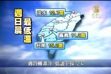 2011-03-22 21:06:42冷氣團發威,22日最低溫出現在淡水11.7度,氣象局特別提醒,未來一週都是冷颼颼的天氣,中部以北低溫下探12度,南部也只有15度,尤其北部、東北部還有鋒面報到,將出現短暫雨,轉為濕冷的天氣型態。