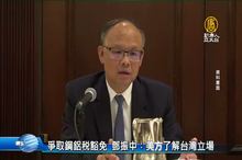 2018-07-02 20:08:10好,再來看到,針對美國對鋼鋁課徵高關稅,台灣持續爭取國家豁免及貨品豁免,剛結束訪美行程的行政院政務委員鄧振中,今天表示,美方了解台灣的立場,但還是要由美國總統川普,做最後決定。經濟部長沈榮津也表示,台灣目前還沒爭取到豁免,但隨時與美方保持順暢的溝通管道,如果美方提出補充資料的需求,一定會積極配合。
