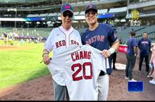 郭台銘觀看美國大聯盟球賽 向張育成致意