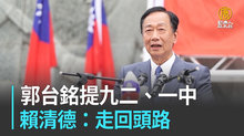 2023-05-13 19:09:53鴻海創辦人郭台銘積極爭取國民黨提名,每天都有大動作,今天(13日)來到金門批評民進黨背離九二共識,引來危機。郭台銘強調如果當上總統,就用「一中各表」基礎與對岸重啟談判,共機也就不會再擾台。而民進黨總統提名人賴清德今天在屏東造勢,他直言九二共識就是走回頭路,沒主權的和平,不是真正的和平。