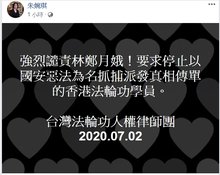 2020-07-02 12:59:17台灣法輪功人權律師團發言人、人權律師朱婉琪2日在臉書發表聲明,強烈譴責林鄭月娥!要求停止以國安惡法為名抓捕派發真相傳單的香港法輪功學員。