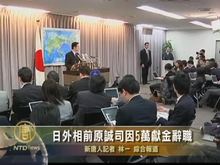 2011-03-07 21:45:21來看到另一個國際焦點,日本外相前原誠司,因為被在野黨指控幾年間每年接受一名旅日南韓女性5萬日元(新台幣約一萬八仟元)捐款,決定引咎辭職。