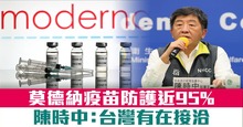 美國莫德納藥廠研發的中共肺炎疫苗,預防效力達到94.5%。台灣是否有可能買到這一款疫苗,衛福部長陳時中今天(17日)受訪時表示,任何廠商都有在接洽。疫情指揮中心發言人莊人祥也表示,先前就和莫德納接洽,雙方也有意願合作。莫德納目前列入COVAX第二期名單,不過還沒確定公布時間。