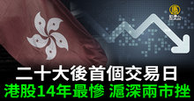 二十大後首個交易日 港股14年最慘 滬深兩市挫