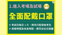 2020-04-10 16:51:23今年四技二專暨二技統一入學測驗,與國中會考,將分別於5月2日與3日,以及5月16與17日進行,教育部因應中共肺炎(武漢肺炎),要求在考場的所有人員都必須配戴口罩,如果考生沒戴口罩將會予不計分處分,並且往年常見的家長陪考,今年也全面禁止,改由學校組成考生服務隊。