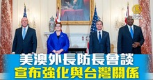 2021-09-17 09:18:24美國與澳洲外長、防長今天召開高層會談,聚焦中國挑戰。雙方會後發表聯合聲明,強調台灣在印太區域扮演重要角色,未來將強化與台灣關係、挺台國際參與,並籲兩岸議題和平解決。