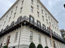 2022-09-20 21:03:31我國位於美國華府威斯康辛大道的駐美軍事代表團大樓完成整建啟用,訪美立委和駐美代表蕭美琴、代表團長余劍鋒日前合影,揭露整建完成的地下室餐廳。金字的「中華民國駐美軍事代表團ROC Defence Mission To The U.S.A」和國旗相當醒目。