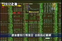 2012-01-16 21:03:29馬英九連任總統,不過,台股期待的慶祝行情卻受到歐債危機拖累,今日早盤隨即破滅。馬英九總統連任成功激勵台股今天(週一)以小高盤開出,但受標普大砍歐元區9國信評的衝擊,早盤由紅翻黑,宏達電成多頭指標,馬友友概念股相對撐盤,盤中最低下探到7091.35 點,高低點差距達167點,終場則以7103.62點作收,下跌77.92點,成交764.11億元。