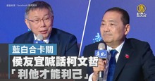 2023-10-16 19:15:09藍白合首次協商卡關,國民黨提出民主初選方案,民眾黨要全民調,雙方無法取得共識,柯文哲批評侯陣營選不上總統。侯辦認為沒有完全破局,爭取明天(17日)第二次幕僚會前會。倒是柯文哲妹妹柯美蘭,上節目喊話,合不來就趕快找別人合,認為與郭台銘也可以先談合作。