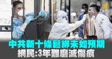 2022-12-08 07:07:43中共在海內外壓力下,公布所謂的新防疫10條,稱不查驗健康碼,不再開展落地檢。不過,新10條因為繼續保留高風險區,而且,要憑核酸檢測陰性證明上班,意味著,上班族還要不斷核酸檢測,市場解讀鬆綁不如預期,距離境內完全放寬還存在一定差距。另外,有中國網友留言,這3年留下了難以磨滅的傷痕。