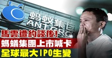 2020-11-04 07:16:53再來關注,全球規模最大IPO,中國阿里巴巴旗下的螞蟻科技集團,原定11月5日在中國和香港同步上市,然而,上海證交所11月3日晚間公布,決定暫緩螞蟻科技集團股份有限公司在科創板上市;集團隨後也宣布暫緩香港上市計畫。11月2日晚上,中共人民銀行、銀保監會、證監會、和國家外匯管理局,對螞蟻集團實際控制人馬雲、董事長井賢棟、總裁胡曉明進行了監管約談,但並沒有公布約談的詳細內容。螞蟻集團計畫集資約344億美元,募資規模成為全球最大的IPO。