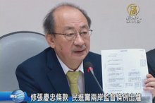 2016-04-01 12:55:02民進黨版「兩岸協議監督條例」出爐,規範談判前、中、後三階段國會監督程序,不過原本黨版草案文字有被民團批為自動生效的「張慶忠條款」,也就是「逾期視為同意」等文字,開完黨團大會後修正為,「逾期需經院會決議」