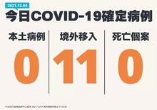2021-12-03 14:24:19今(3)日中央流行疫情指揮中心公布,國內本土病例持續零確診,新增11例COVID-19境外移入確定病例;另確診個案中無新增死亡。