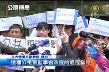 2013-01-21 21:13:24繼續是今天其他的新聞焦點。公視董事人選持續難產,媒改團體今天(21日)到公視大樓前靜坐抗議,隨後步行到行政院,要求政府儘速研擬修法,讓已經獲選的13席董事立刻就任,召開董事會,解決公視延宕已久的問題。