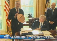 2017-02-09 07:08:51早安新唐人,帶您看到美國半導體龍頭,英特爾,響應川普美國製造政策,執行長科再奇 今天拜訪美國總統川普時,宣布將投資70億美元,相當於2200億台幣,打造全球最先進的晶片生產基地,最高可帶來上萬工作機會,馬上來看到稍早收到的畫面。