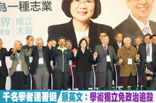 2015-12-31 12:36:212015年最後一天,千名海內外學者成立學術界後援會,力挺同是學術界出身的「英仁配」,蔡英文也承諾選後給學術界獨立自由空間,可以嚴厲監督政府,也不用怕政治追殺。
